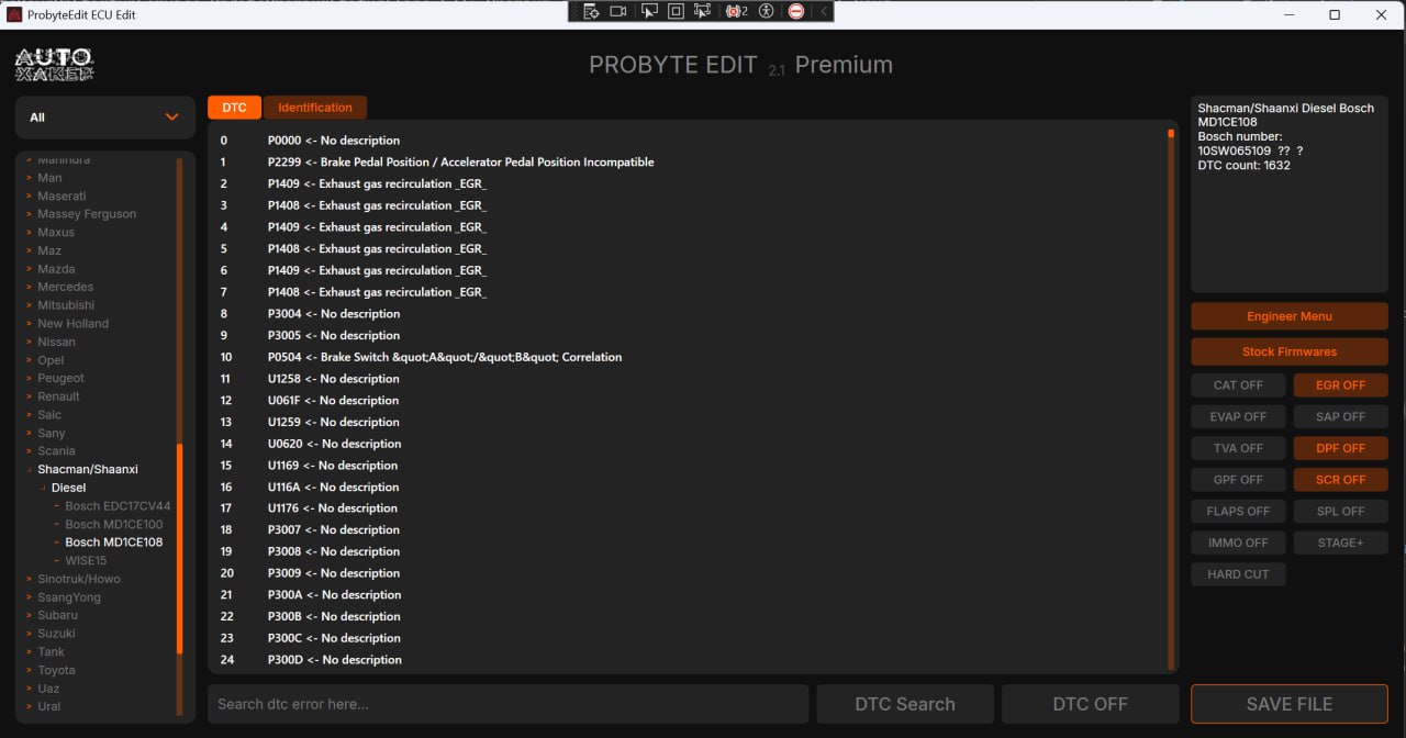 Shacman/Shaanxi MD1CE108 for ProByte Edit: EGR, DPF, FLAPS, DTC
