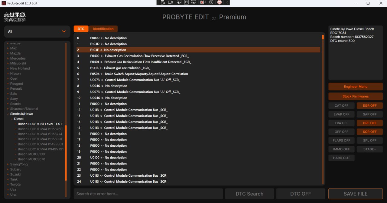 Sinotruk/Howo EDC17C81 for ProByte Edit: EGR, DPF, SCR, DTC