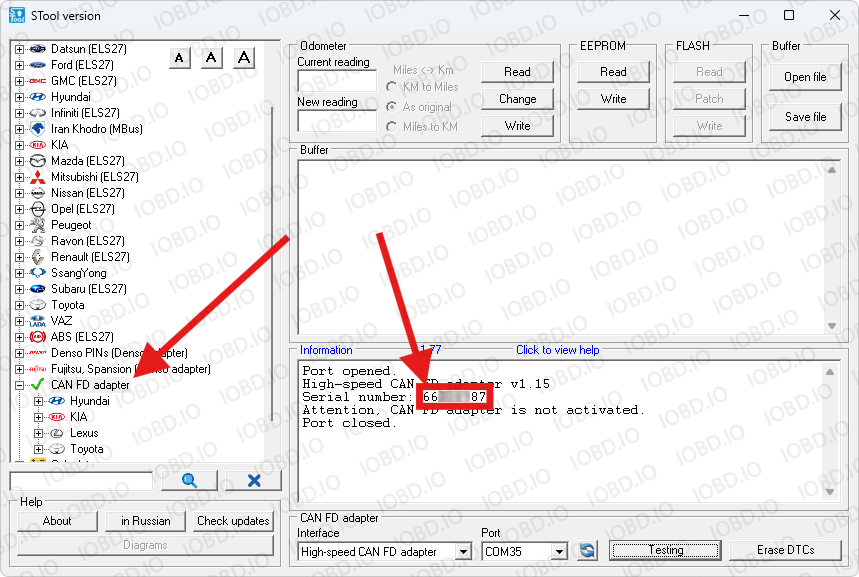 The CAN-FD adapter number can be seen on the sticker on the adapter or in the program, click on the "CAN FD adapter" section and test the device.