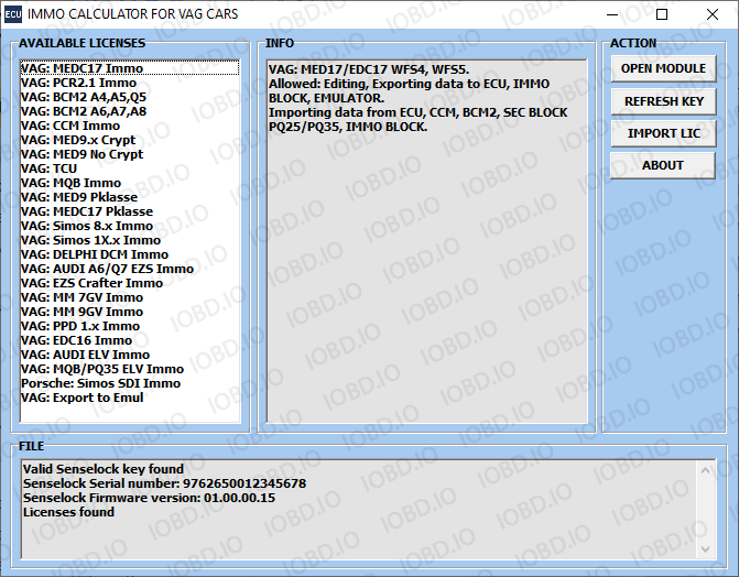 Activation requires the VAG IMMO Calculator base package. When ordering, please indicate the Serial Number of the key.